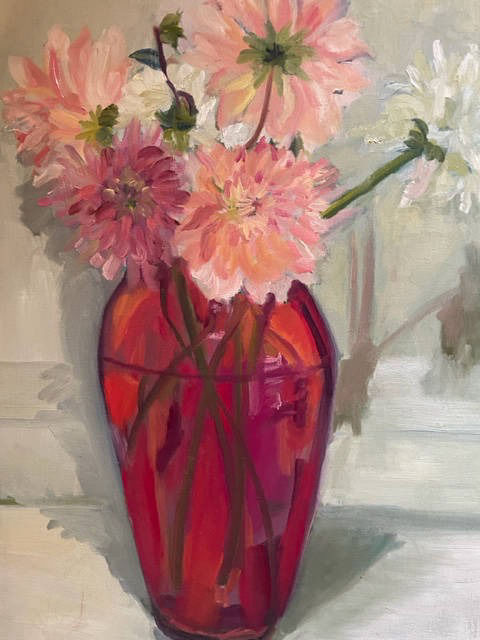 Dahlias in Red vase 18x24